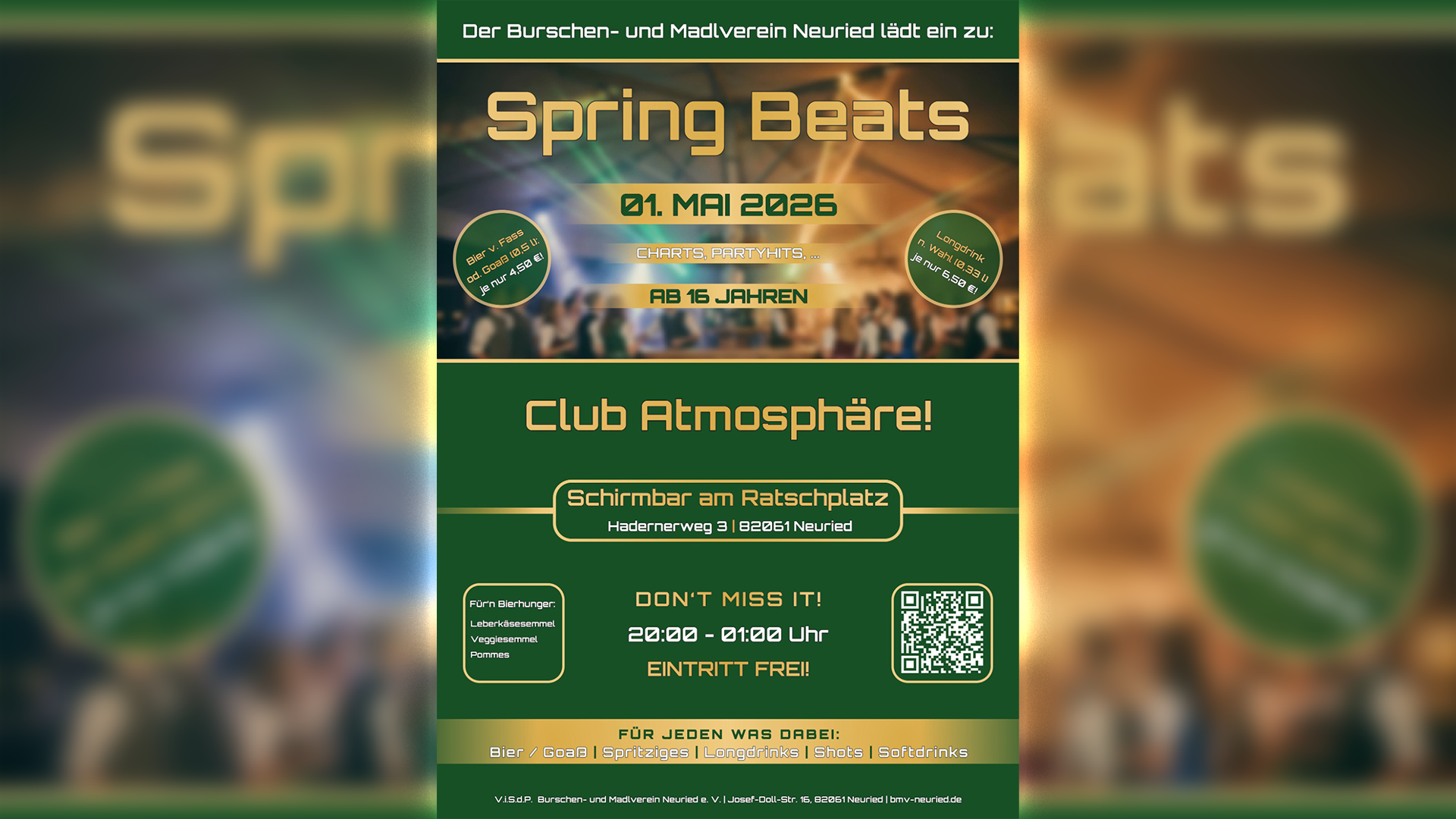 Am Abend des 01. Mai 2026 startet unsere erste Spring Beats Party in der Schirmbar am Ratschplatz in Neuried.